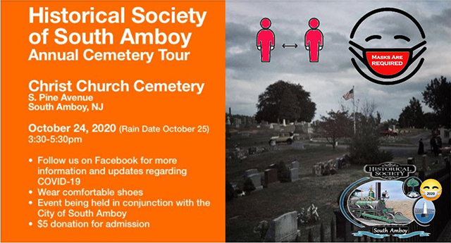 October 16, 2020The Historical Society of South Amboy is hosting the Annual Cemetery Tour on October 24, 2020 at Christ Church Cemetery, located at S. Pine Ave., from 3:30 to 5:30 p.m. Donation of $5 for admission. Masks will be required.