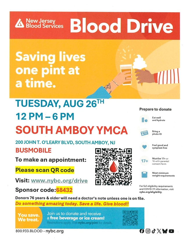 August 19, 2025Help save lives one pint at a time by joining us for an important community blood drive at the South Amboy YMCA!