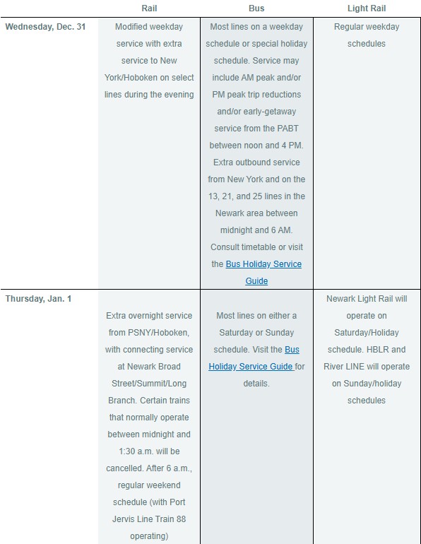 On New Year’s Day, Thursday, January 1, after 6:30 a.m., trains will operate on a weekend/major holiday schedule on all rail lines (with Port Jervis Line Train 88 also operating). Most bus lines will operate on either a Saturday or Sunday schedule, consult timetable or visit the holiday service guide for details. Newark Light Rail will operate on Saturday/Holiday schedule. HBLR and River LINE will operate on Sunday/holiday schedules.